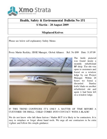 From: Martin Rackley, HSSE Manager, Global Alliance. Ref. No I/09 Date: 31.07.09