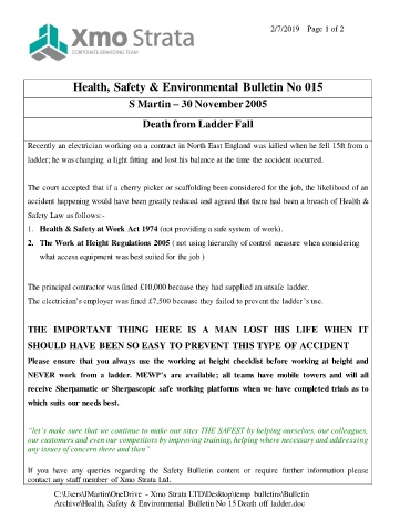 Archive\Health, Safety & Environmental Bulletin No 15 Death off ladder.doc