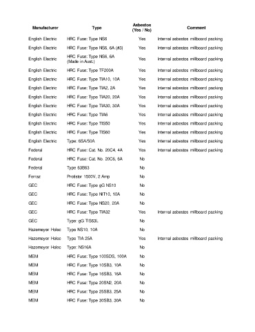English Electric HRC Fuse: Type TF200A Yes Internal asbestos millboard packing