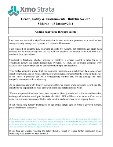 I am pleased to confirm that, following an audit by Allianz, our premium has again been